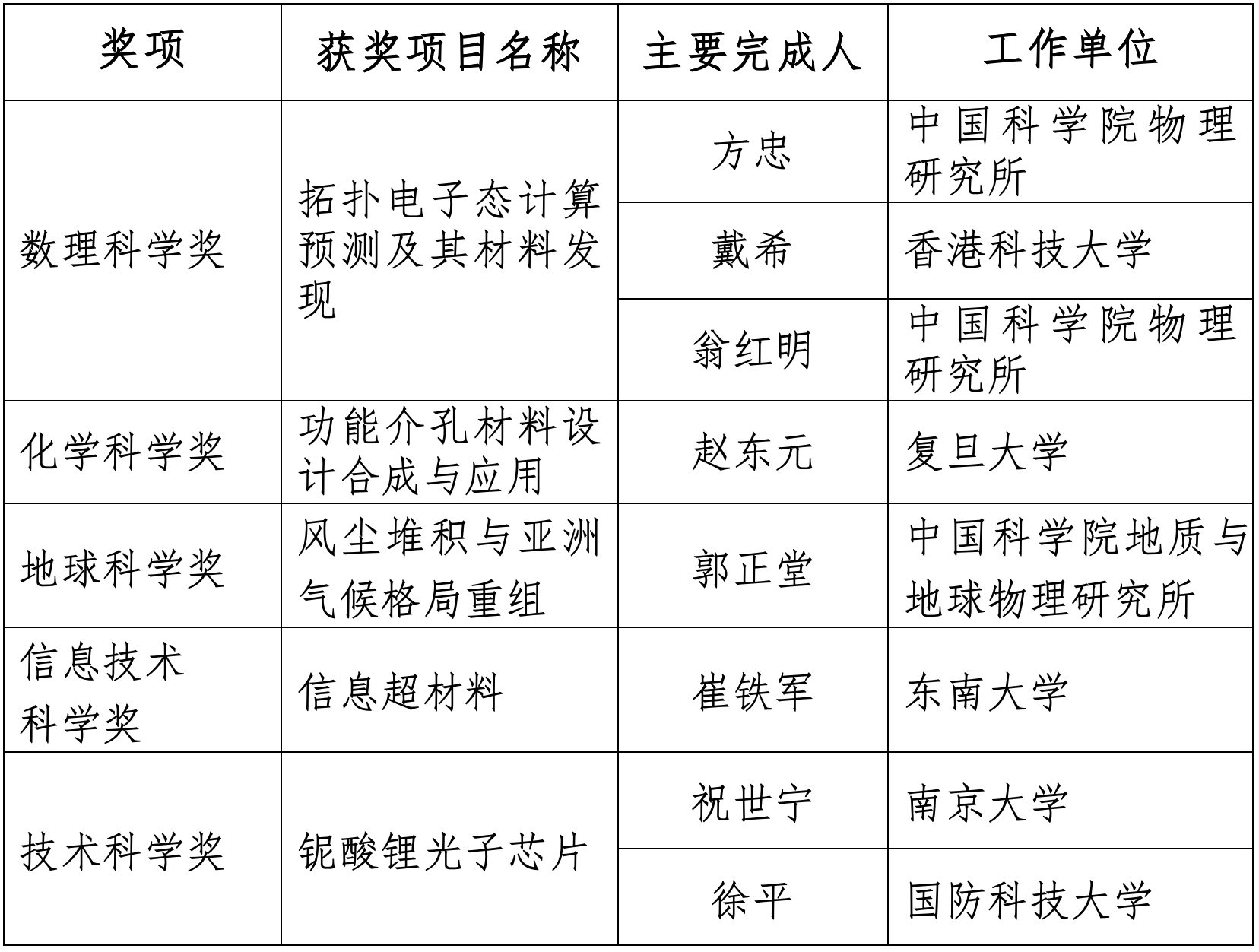 根据《陈嘉庚科学奖奖励条例》《陈嘉庚青年科学奖奖励条例》和《陈嘉庚科学奖和陈嘉庚青年科学奖奖励条例实施细则》规定,经陈嘉庚科学奖各评奖委员会严格评审,并经陈嘉庚科学奖基金会理事会审议批准,决定授予“拓扑电子态计算预测及其材料发现”等5个项目2024年度陈嘉庚科学奖,授予马滟青等10人2024年度陈嘉庚青年科学奖。