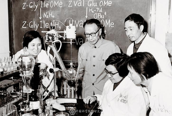 1963年,邢其毅(左二)指导北京大学化学系师生进行胰岛素人工全合成研究。背景为牛胰岛素分子式