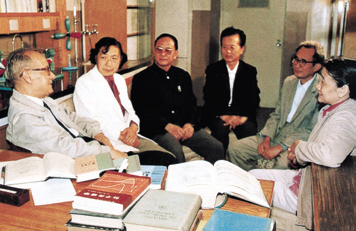 1988年,徐光宪(左1)与北京大学稀土研究中心的部分学术骨干讨论工作。左2为黄春辉,右2为黎乐民(图片来源:中国科学院院士文库)